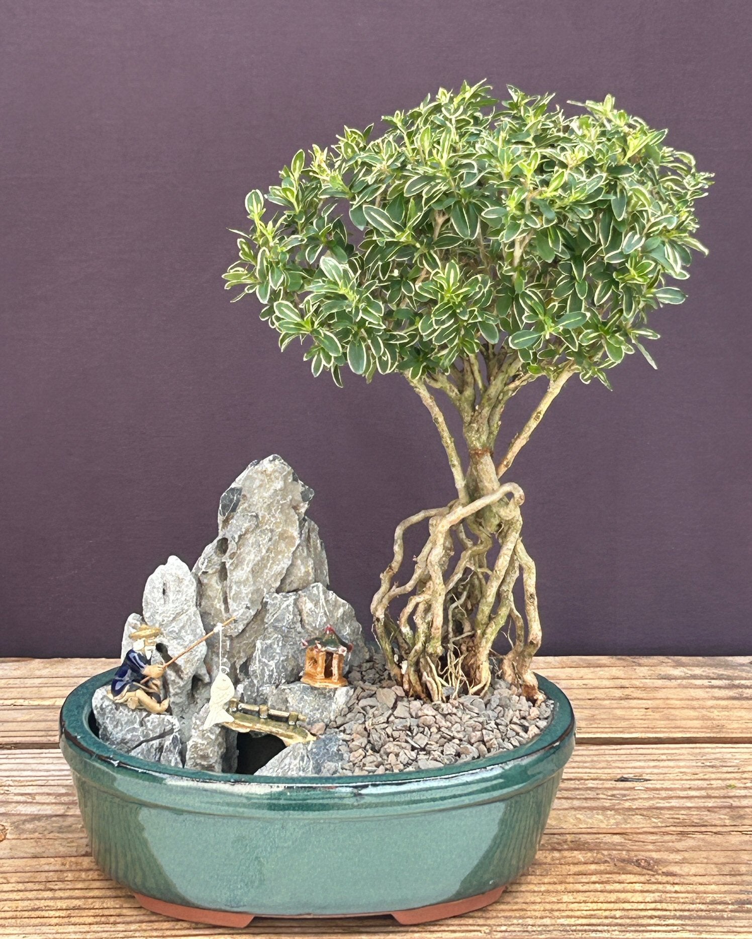 The rocks selected for this unusual arrangement are imported and washed in acid, making them strikingly unique. We then cut and cement the rocks to one side of the pot and create a well on the opposite side. A ceramic bridge is cemented to the rocks on either side. A pagoda figurine is also added and cemented to the stone located above the bridge. To complete the scene, we cement a miniature, glazed, mud figurine fisherman overlooking the well, holding a fishing pole and fish. On the opposite side of the restful scene, we have selected for planting, the flowering Mount Fuji Serissa. Beautiful white, star-shaped, miniature flowers. This sub-tropical variegated evergreen, which is imported from Japan, can bloom profusely with delicate white miniature flowers. Loves direct sunlight.