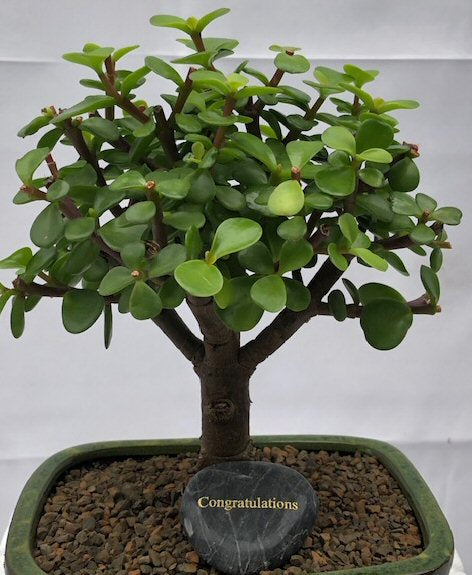 An engraved message in gold lettering on a shiny, glossy Black Zen Skipping Stone to complete your Bonsai tree gift! Let your sentiments be a consistent reminder to your recipient while the tree grows and grows.